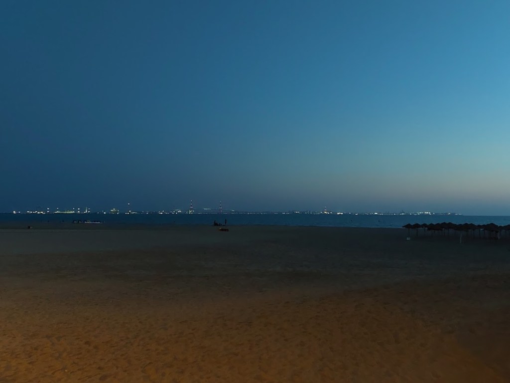 De una punta a otra de la playa, los bloques de apartamentos, unos más feos que otros, nos recuerdan que a todo el mundo le gustan las gambas. La hilera de restaurantes invita a vivir el instante: ahora, aquí. Todos pasean en manga corta, faldas cortas, pantalones cortos, que airean extremidades deseosas de verano, muchas de ellas vestidas de tatuajes. Imagino que se los han hecho en sus barrios, en sus paradas en mil puertos, de Algeciras a Estambul. También la playa se presenta como ser vivo con los grupos de jóvenes que la pueblan, en corros, con o sin guitarra, con bebidas todos, alegres cuerpos sin arrugas que se buscan, para solaz de los paseantes maduros. Debería volver al hotel y zambullirme en la lectura o en la escritura. Pero el dibujo de ondas violetas de un rótulo de neón me cautiva. Así se llama el chiringuito, Las Olas. Dónde, si no, puedo tomar la dosis de emoción líquida que el momento propone y recordar todo y olvidarlo, o no, después de beber. Sur intenso, de noche, al borde de la playa, en Las Olas. En la mesa de al lado, tres chicas jóvenes desbordantes de gracia y atractivo desprecian a los chicos que las pretenden desde otra mesa y conjeturan sobre el marino solitario que no tiene pipa ni garfio, pero sí una libreta color azul mar que las convierte en letras vivas sin que ellas lo noten, mientras las estrellas titilan en el cielo en la noche del sur.