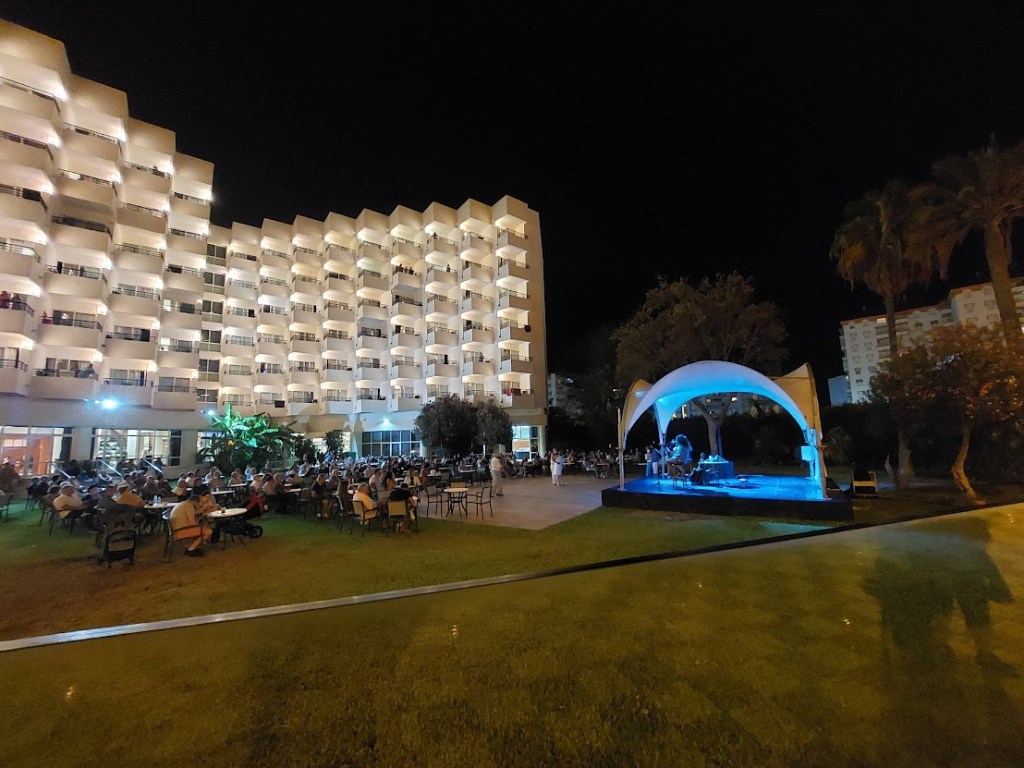 Desde el balcón observo la gran terraza con escenario cubierto por un techo de lonas, cuya estructura sostiene unos focos que pelean inútilmente con la luz del día. Empieza a haber movimiento. Agarrada al micrófono, la animadora arenga al primer grupo de huéspedes que se acercan indecisos y de paso a quienes la escuchan desde sus habitaciones o la piscina. Su trabajo es convocarnos, que dejemos lo que estamos haciendo y acudamos a ella, cosa que haremos sin cuestionarnos nada. Luego, ella se retirará y entrará el artista de turno. Ese es su trabajo. Por eso le pagan. Y lo hace con una voz preciosa, imposible de ignorar. Es parte necesaria del espectáculo, que no existe sin espectadores. Lo hace bien, pero no es un trabajo fácil. Remata la faena con una sonrisa encendida por la última luz del día, que viaja por un mar azul rojizo en el que se ha escondido el sol. La crónica me llama. Tengo que bajar.