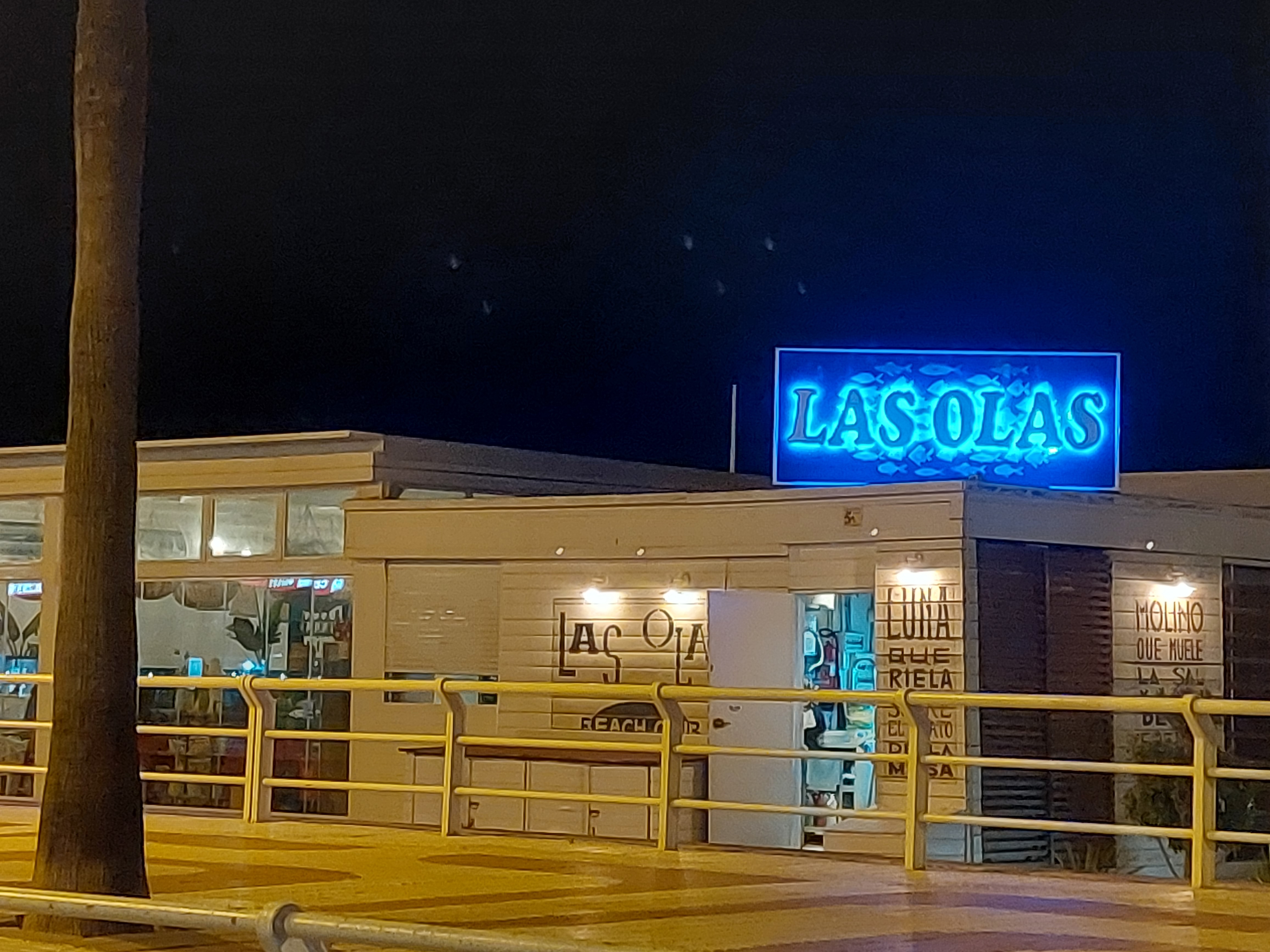 De una punta a otra de la playa, los bloques de apartamentos, unos más feos que otros, nos recuerdan que a todo el mundo le gustan las gambas. La hilera de restaurantes invita a vivir el instante: ahora, aquí. Todos pasean en manga corta, faldas cortas, pantalones cortos, que airean extremidades deseosas de verano, muchas de ellas vestidas de tatuajes. Imagino que se los han hecho en sus barrios, en sus paradas en mil puertos, de Algeciras a Estambul. También la playa se presenta como ser vivo con los grupos de jóvenes que la pueblan, en corros, con o sin guitarra, con bebidas todos, alegres cuerpos sin arrugas que se buscan, para solaz de los paseantes maduros. Debería volver al hotel y zambullirme en la lectura o en la escritura. Pero el dibujo de ondas violetas de un rótulo de neón me cautiva. Así se llama el chiringuito, Las Olas. Dónde, si no, puedo tomar la dosis de emoción líquida que el momento propone y recordar todo y olvidarlo, o no, después de beber. Sur intenso, de noche, al borde de la playa, en Las Olas. En la mesa de al lado, tres chicas jóvenes desbordantes de gracia y atractivo desprecian a los chicos que las pretenden desde otra mesa y conjeturan sobre el marino solitario que no tiene pipa ni garfio, pero sí una libreta color azul mar que las convierte en letras vivas sin que ellas lo noten, mientras las estrellas titilan en el cielo en la noche del sur.