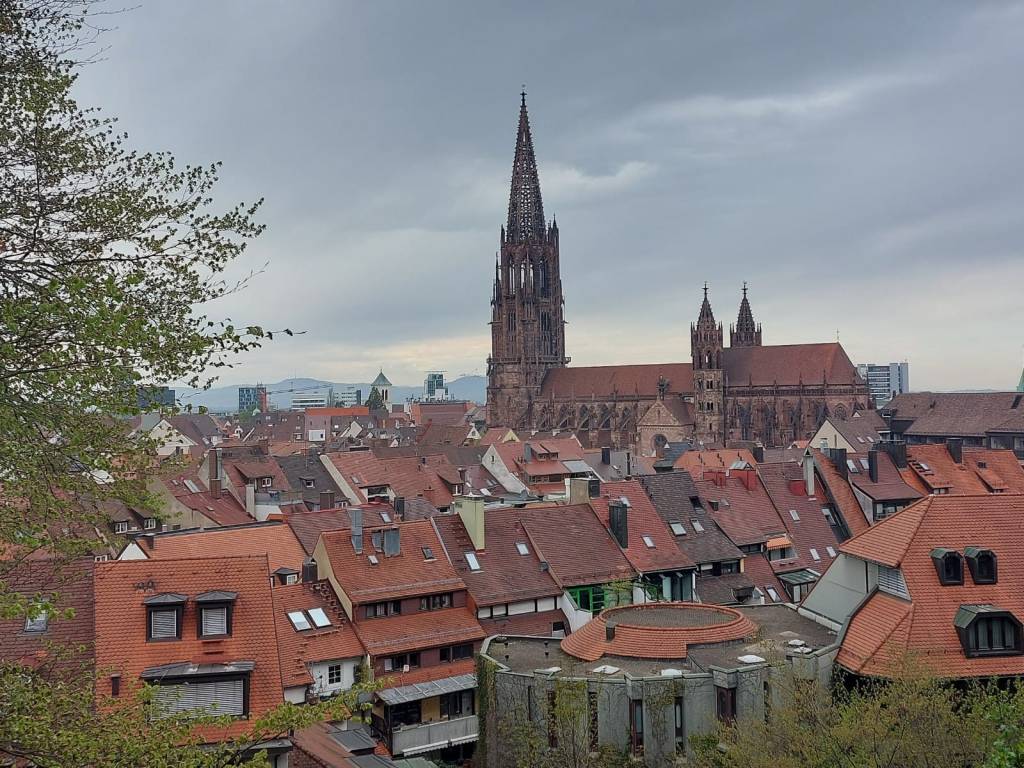 No perder nada de este momento de felicidad súbita, de los nuevos compañeros de estudios, del nuevo idioma que se resiste, pero no deja de invitar. Allí, en el mirador, mientras los cachitos más traviesos de la serpiente interrumpen algún beso con vistas, junto a las risas cada vez más reconocibles como sonido de referencia, se graba para siempre la imagen de la torre que resistió, la catedral que ordenó la vida durante tantos siglos, los tejados inclinados (la vista real coincide con la imagen previa que desde niño uno se ha forjado de Alemania y eso produce un gozo interior extra) dan personalidad a la ciudad que se extendió despreocupadamente a lo largo de décadas reconstrucción primero y de prosperidad después (zuerst und dann) hacia los montes que anuncian la Selva Negra. Es en ese momento de confluencia de memoria, novedad y plenitud cuando se materializa la epifanía. El corazón se hincha, el recuerdo se nutre, pide salir al exterior, conectar con el resto de la vida.