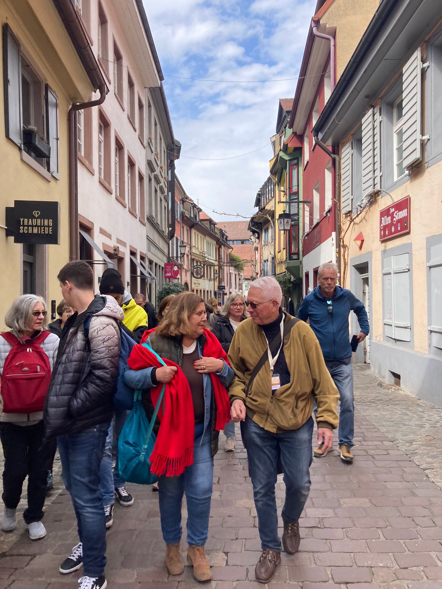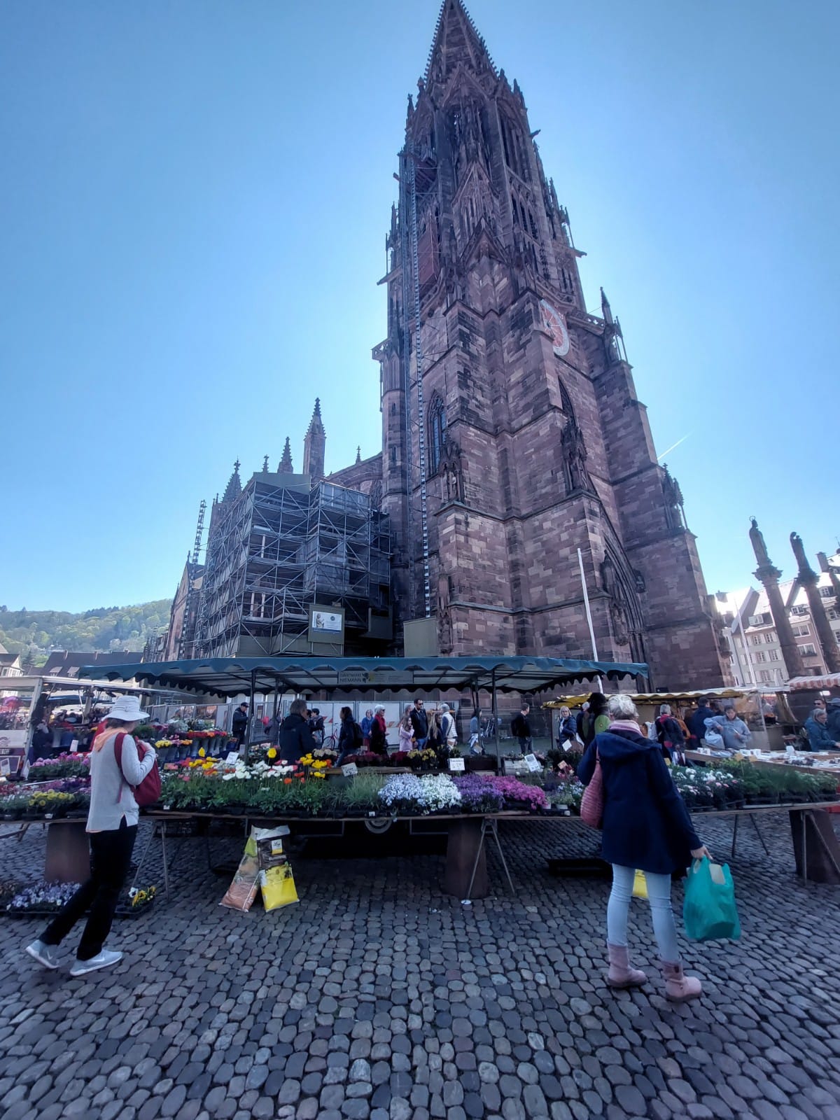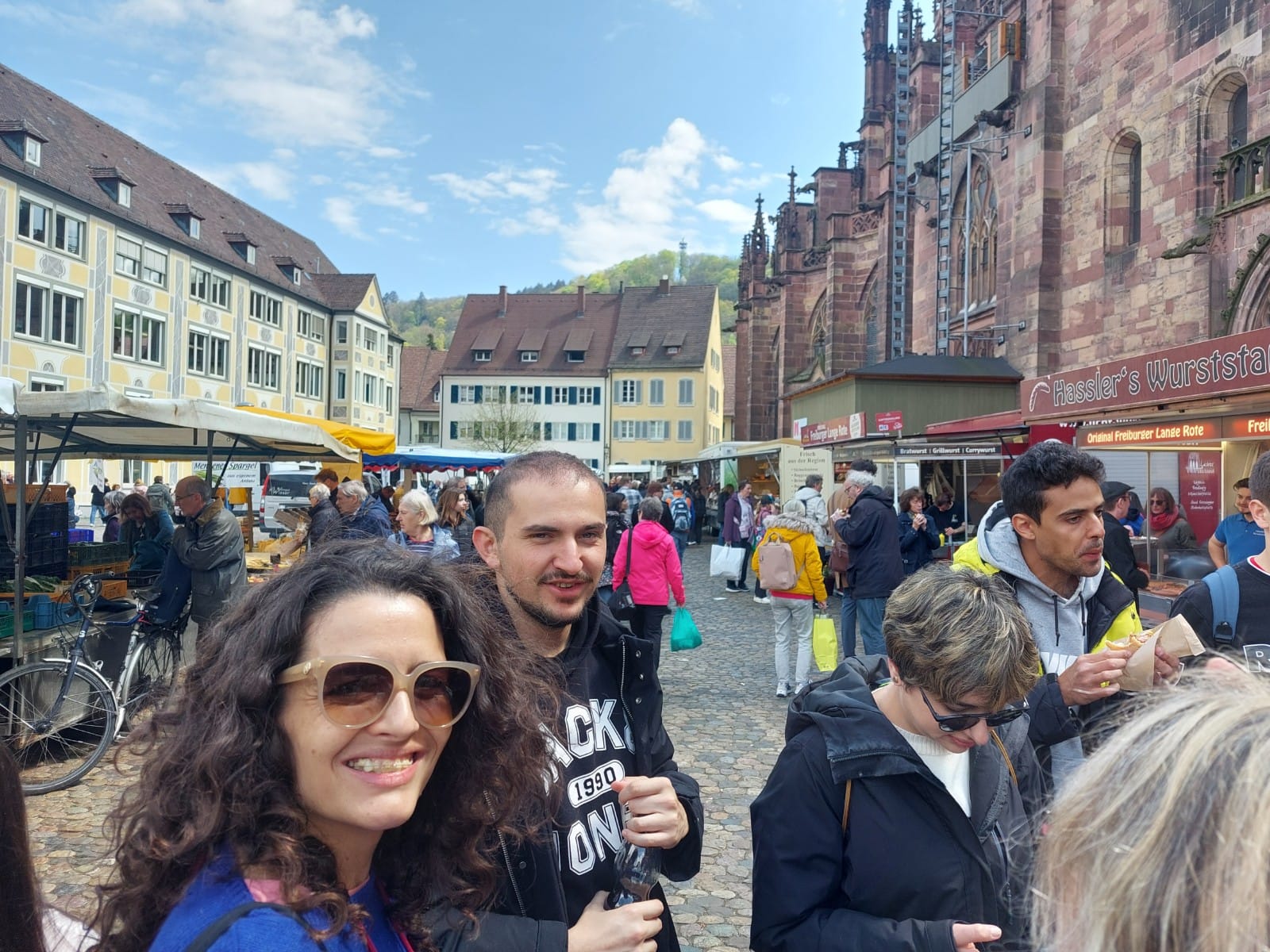 La serpiente se estira y se encoge alegre por las calles de Friburgo hasta desembocar en la plaza de la catedral donde se disuelve con jolgorio estudiantil. Se escinde en pequeñas partes (Stück oder Teil?, ich habe eine Frage, bitte) llenas de energía y curiosidad que se lanzan a rondar los puestos de alimentación y artesanía, las terrazas y las casetas de comida. Qué salchicha escoger, por qué es tan delicioso todo, el bullicio, la vida local, la alegría que reparte entre todos este rayo de sol después del frío día anterior, siempre alrededor de la catedral que preside la vida local desde hace 900 años.